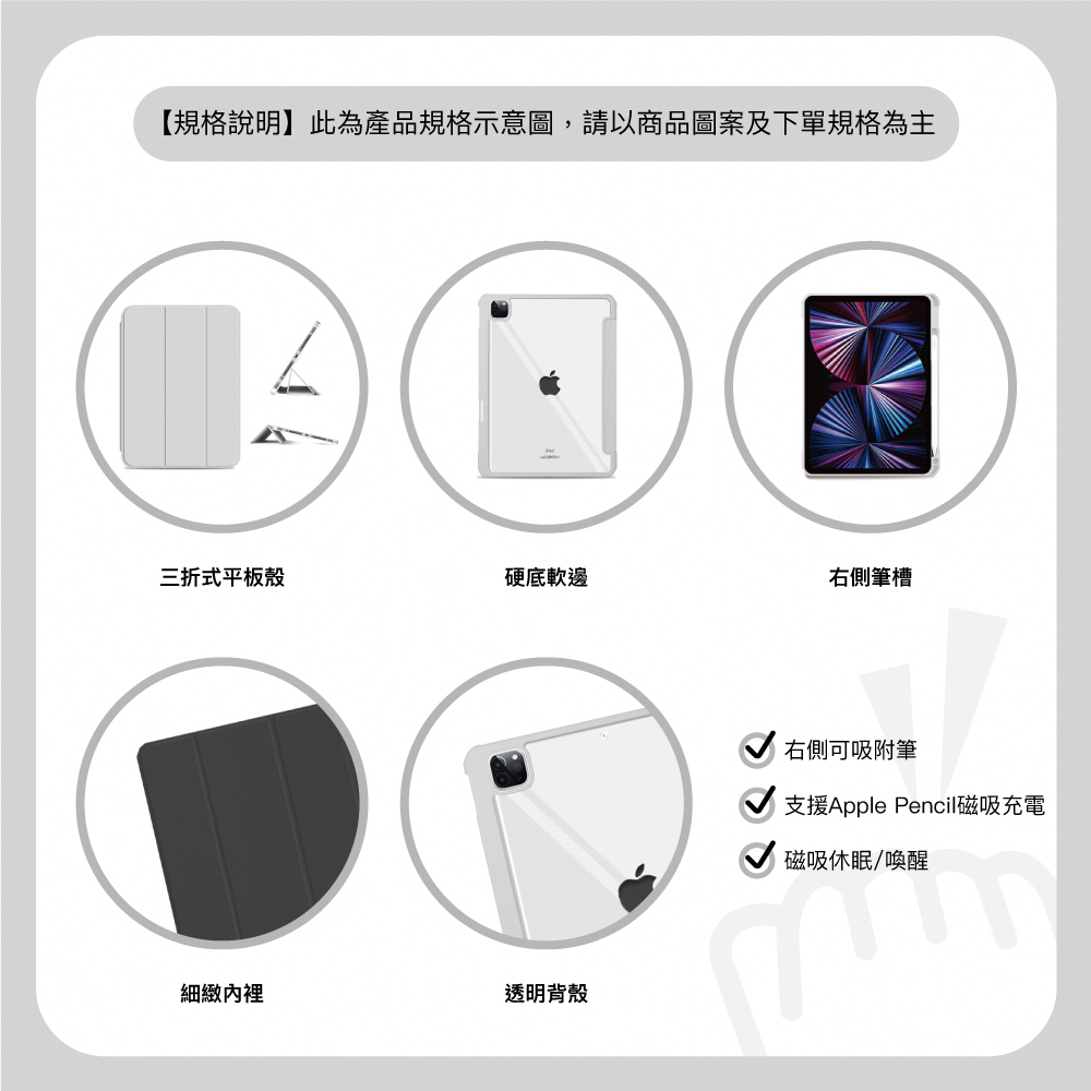・底部透明硬殼設計,防止平板彎曲變形,給iPad完整保護