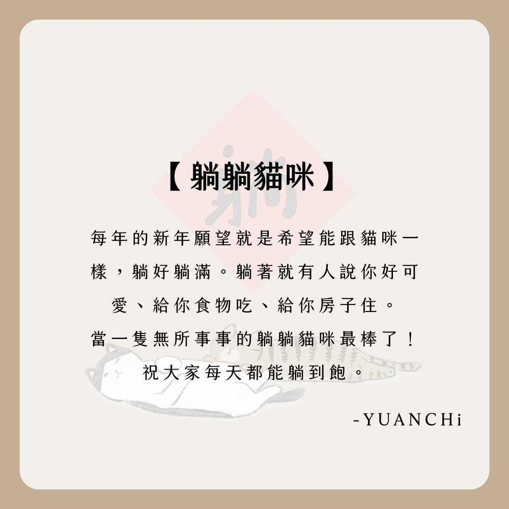 每年的新年願望就是希望能跟貓咪一樣,躺好躺滿。躺著就有人說你好可愛、給你食物吃、給你房子住。當一隻無所事事的躺躺貓咪最棒了!祝大家每天都能躺到飽。
